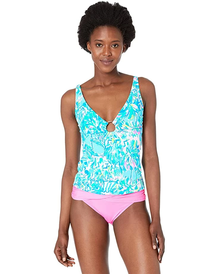 - The Lilly Pulitzerยฎ Brenta Tankini Top sets apart your swim style with a vibrant, sun-kissed coral design that will catch eyes from surf to shore. This versatile, full-coverage swim top features an elongated V-neck with dazzling, gold-tone center circle and convertible back straps for variable support.