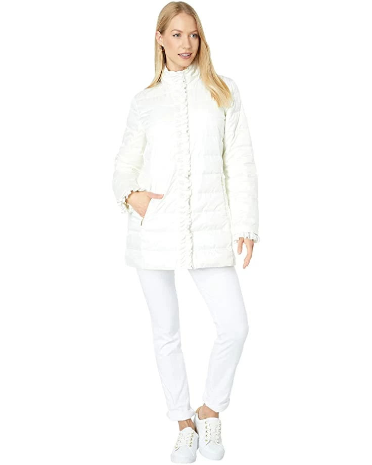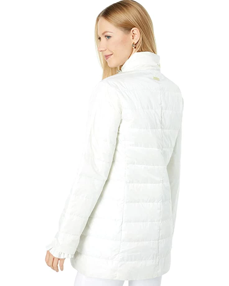 - Stay warm when cooler days arrive with the chic Lilly Pulitzerยฎ Doria Jacket featuring a down filling, ruffled trim, signature Lilly Pulitzer print lining, and stand-up collar.