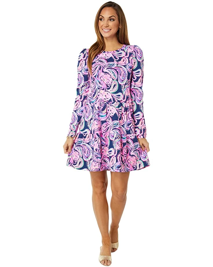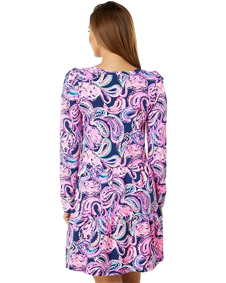 - Smiles abound when you spend the season looking fab in the Lilly Pulitzer® UPF 50+ Arlette Dress. Crafted for style and comfort, this dress features a rounded neckline, puffed shoulders, long sleeves with three button cuffs, all over paisley inspired design, and a ruffled skirt hem.
