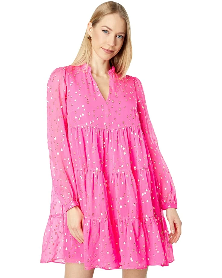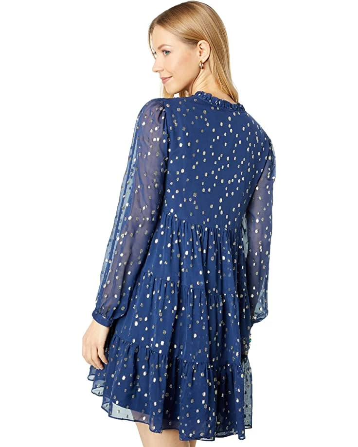 - Show your style in the Lilly Pulitzerยฎ Sarita Silk Dress. Crafted for comfort and style, this dress features a low v-cut neckline, mandarin ruffled collar, long sleeves with elasticized cuffs, allover polka dot inspired design, and a ruffled hemline.